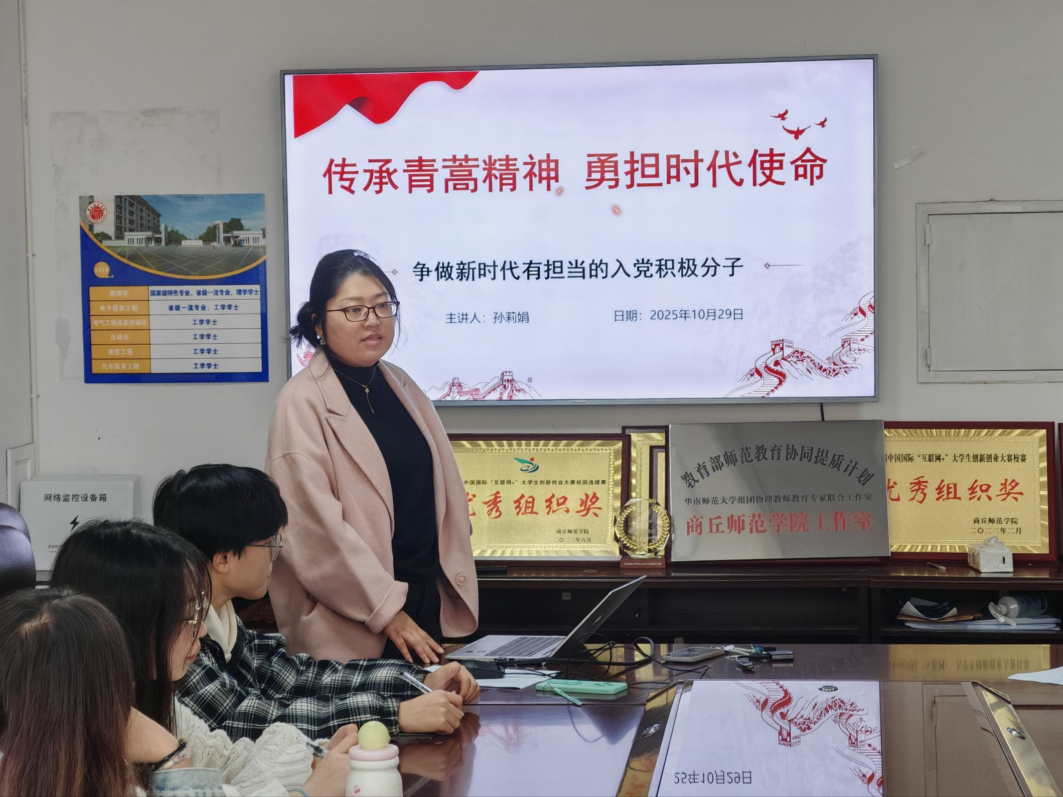 10月29日,学生第四支部书记孙莉娟为入党积极分子上党课,主题为以“传承青蒿精神,勇担时代使命”。