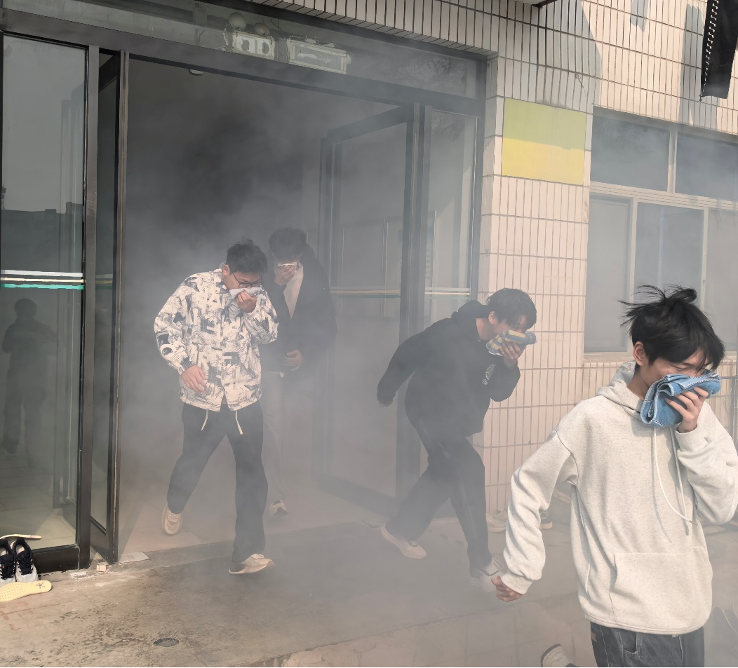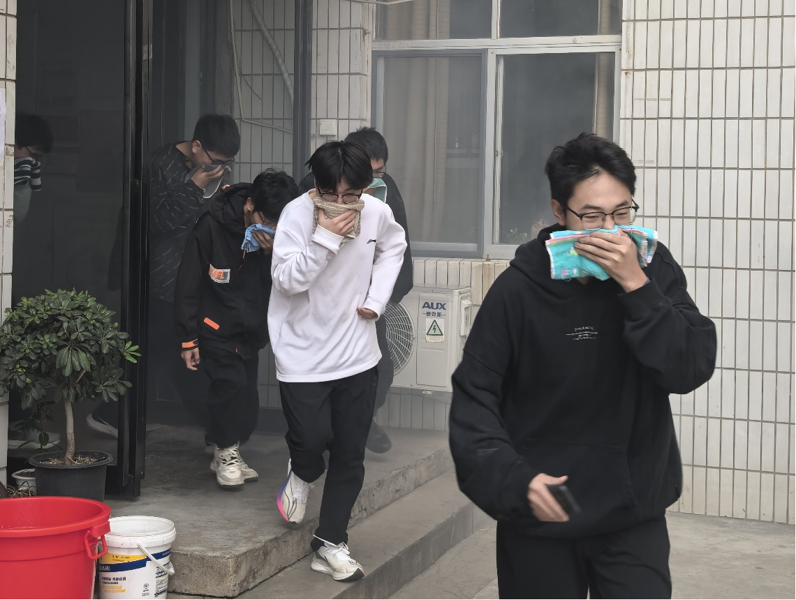 中午13点,演练正式启动。7号、9号、10号宿舍楼内模拟突发火情,各楼层引导员立即按照预设预案,迅速组织学生用湿毛巾捂住口鼻,采取弯腰低姿的正确逃生姿势,沿指定疏散路线快速向安全区域撤离。整个过程紧张有序、规范高效,学生们严格遵守逃生规范,无推挤、慌乱现象,仅用数分钟便全部安全撤离至指定集合点,圆满完成各项预设科目,达到预期演练目标。