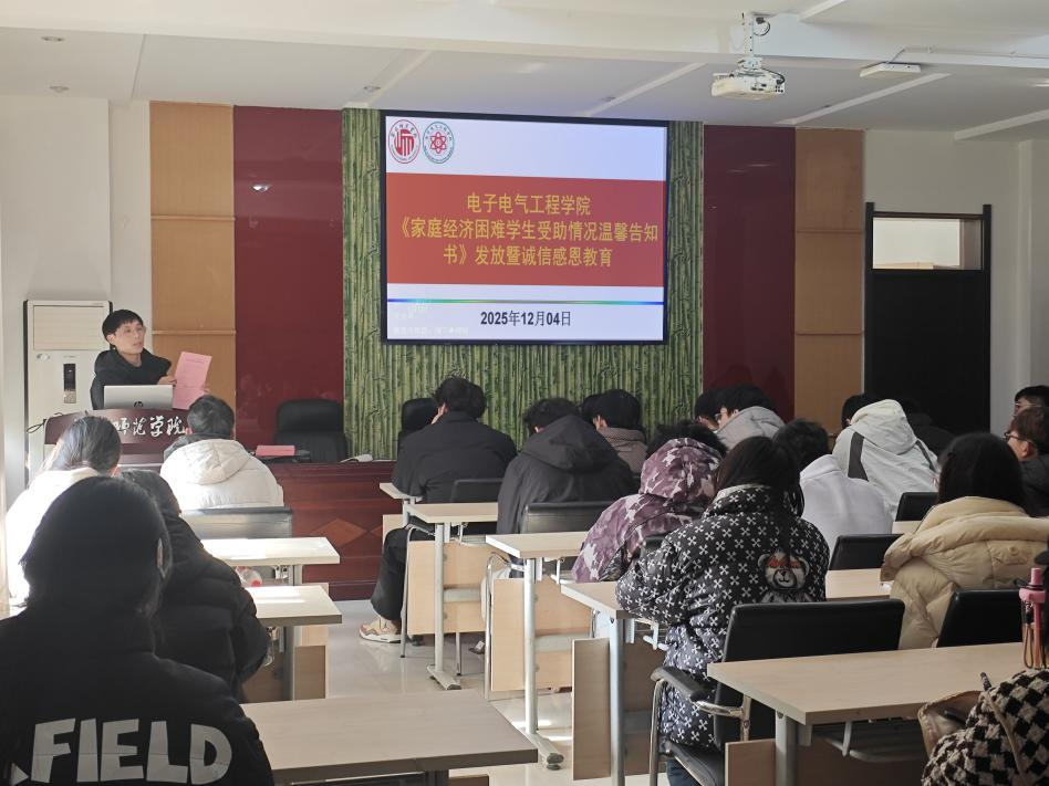 12月4日,电子电气工程学院开展《家庭经济困难学生受助情况温馨告知书》发放暨诚信感恩教育,会议由学院资助专员王兴老师主持。