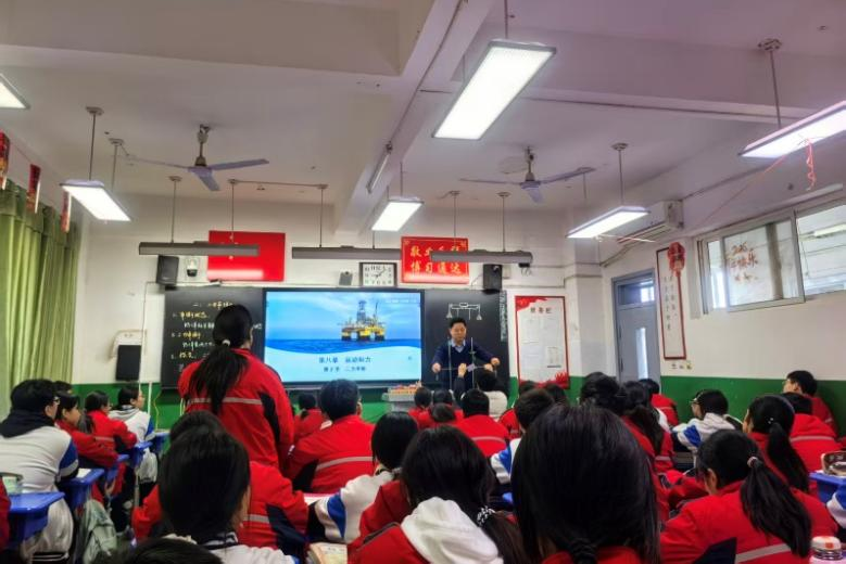 随后,实习生们进入教室后排观摩学习。崔老师从“海上钻井平台”等生活实例切入,引导学生认识平衡状态;通过演示实验探究二力平衡的条件,结合板书梳理知识脉络,并邀请学生互动回答,让抽象的物理规律变得直观易懂,课堂氛围活跃且富有探究性。课后,崔自明老师再次组织坊员进行课后研讨。大家围坐交流听课心得,分享对课堂设计、实验教学和学生互动等教学环节的设计与思考,进一步深化了对物理课堂教学的理解。也通过这堂课的分析解答了听课前的疑惑。
